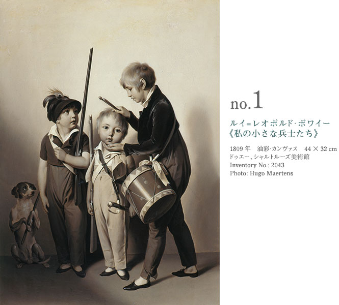 《私の小さな兵士たち》は1809年のサロンに《軍事教練をする画家の3人の子どもたち》として出品された。《私の小さな兵士たち》というのは、後にこれが版画化された時につけられたタイトルである。画家の2度目の結婚で生まれた3人の息子を描いたもので、単色のいわゆるグリザイユである。色がないだけにデッサン、形が目立っているが、ボワイーらしいアカデミックで正確なデッサン力はここでも健在である。パリ市民の風俗的な主題を得意としたボワイーは、兵隊に扮した子どもたちの愛らしくあどけない表情や、正面を向いた弟のポーズに注文をつけている横向きの兄、その兄をみつめる二男など、微笑ましい「子どもの情景」を演出している。後ろに控える犬も、ボワイーらしいユーモアのセンスを感じさせる。