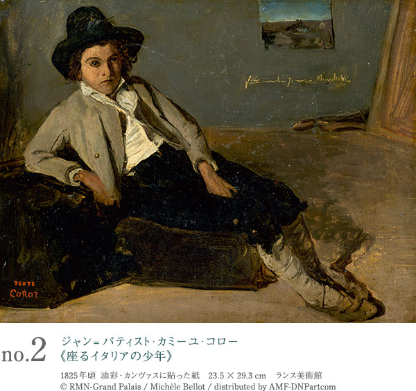 コローは生涯に3度イタリアに旅行しているが、これは彼が29歳の時の最初の旅行の収穫のひとつ。おそらく旅の途上で出会った少年をモデルとしているが、この頃の有名な《イーゼルに向かう自画像》と同様、褐色系の抑えた色調が目立っている。自然体のくつろいだポーズを取る少年の素朴な印象は、コローが描いた他の子どもの絵にも共通するが、コロー自身は生涯独身で、父親となることはなかった。