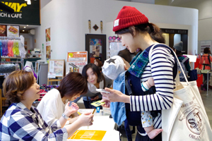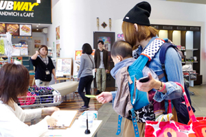 第一部は、赤ちゃんを対象にしたプールでのレッスン。水を怖がらないように、歌やおもちゃを使って楽しく遊びながら水とお友だちになるレッスンです。12時半から受付が始まると、応募してくれたファミリーが続々とやって来ました。中には遠方から1時間くらいかけて来てくださったファミリーもいました。受付を済ませ、更衣室で水着に着替えてプールに集合していると、そこに現れたのはモコたろうくんと、ココモちゃん。みんなにごあいさつにやって来てくれました。
