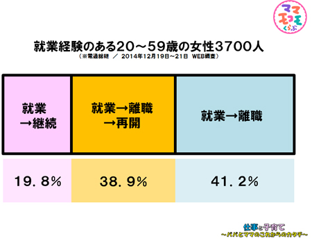 - 今年の春に発表されたデータによると、大学や学校を出て就職して継続している人は全体の20%ほど。子育てやその他の理由で一度離職し復職した人は4割。就職して離職して、そのまま専業主婦になられる人が4割とのことです。(※電通総研「女性×働く」調査 2014年12月19~21日 WEB調査)