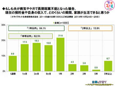 - 夫がなんらかの事情で長期就労不能になった場合、どの期間生活できますか?という調査では、半年が限界が64%、一年以内が85%という結果が出ています。(※ライフネット生命保険株式会社「夫が働けなくなるリスクに関する意識調査」2014年10月24日~28日 WEB調査)