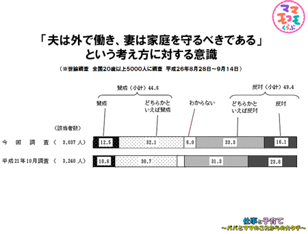 - こちらに意識調査があるのですが、「夫は外で・妻は家庭で」という考えに「賛成」が数年前より増えていますね。(※内閣府大臣官房政府広報室 世論調査「『夫は外で働き、妻は家庭を守るべきである』という考え方に対する意識」平成26年8月28日~9月14日)