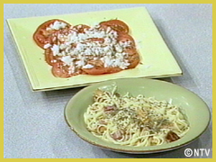 フライパンに茹であげた(5分間)スパゲッティを加えて、How2と絡める クレイジーソルト、白ワイン、こしょう、塩で味を調え、器に盛り、乾燥したバジリコをふりかける |