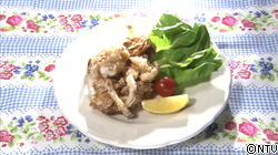 鶏肉に〈A〉の玉ねぎをぎゅっとにぎりながら押しつけ、片栗粉をまぶして170℃の油で揚げます。油をきって器に盛り、野菜とレモンを添えます。