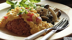 器に(1)を盛り、(3)の卵をのせ、パセリを散らしたら出来上がりです。