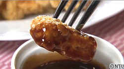 (2)を(3)にくぐらせ、160〜170℃に熱した油で揚げます。