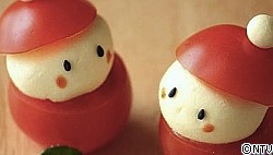 プチトマトのヘタを取り、上1/3のところで切ります。クリームチーズを丸め、顔と帽子の先にします。