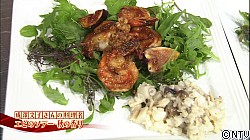エビの両面が焼けてきたら、余分な油を拭き取り、サイの目に切ったいちじくを入れてさっと炒めます。くるみと合わせ調味料を加えて混ぜ合わせ、皿に盛り付けたベビーリーフの上に盛り付けたら出来上がりです。