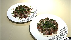 (4)を食べやすい大きさに切り分け(5)と一緒に平皿に盛り付けます。半分には桜えびソース、もう半分には梅わさびソースをかけ、刻んだ細ねぎを散らしたら出来上がりです。