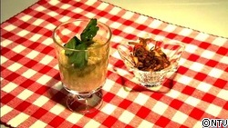 ガラスに器にご飯・フラン・鶏肉の順番に盛り付け、ソースをかけ三つ葉を飾ります。お好みでフライオニオンを添えて出来上がりです。