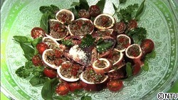 大皿にバジル・イタリアンパセリ・プチトマトとともに(7)のイカを輪切りにして盛りつけます。(8)のソースをかけ、お好みでタバスコをかけて召し上がって下さい。