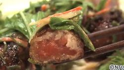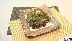 ドレッシングの中に水気をよく切った(4)の野菜を入れてよくからめ、(8)の肉の上にたっぷりとのせます。野菜と一緒に召し上がってください。