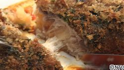 (4)の全体にDの強力粉を塗し→卵→パセリパン粉の順でしっかりとつけます。