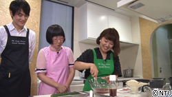 (2)を器に盛り、スライサーでスライスしたきゅうりと温泉卵をのせます。