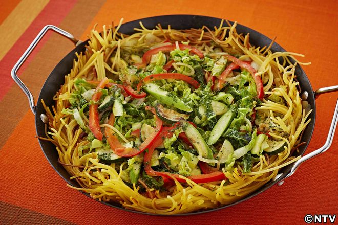 サボイキャベツは太めの千切りにする。 - パエリアパンにオリーブオイルを熱し、