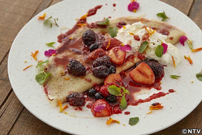 - 焼き上がりのガレットを盛り付け、ベリー類、いちじくソース、はちみつ、エディブルフラワー、ミントを彩りよく盛り添え、シナモンスティックを削る。