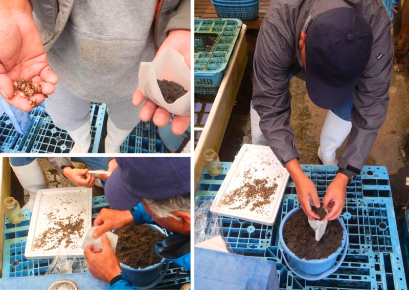 最後に、アマモの種子が入った“不織布ガーゼ団子袋”を投入し、