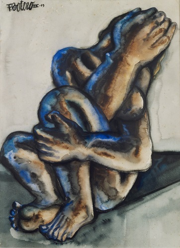 もう、まったく今とは全く違う作風で描かれていますよね。画面いっぱいに描かれた豊満な人体は、オロスコやシケイロスといった、当時のメキシコを代表する著名な壁画作家たちから影響を受けています。水分をたっぷり含んだ筆を使い、極太で武骨な輪郭線を表現したり、紙のにじみを活かした陰影表現を試みたりと、さすがの腕前です。女性の体全体から、涙がにじみ出てきているような、味のある作品です。