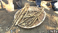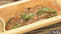 開拓6年目にして、初すすり…。それは、DASH島のユリ根の片栗粉から作った春雨。まずは、片栗粉を70℃のお湯に入れて、混ぜながら加熱して“つなぎ"を作る。しかし、熱加減と混ぜるスピードが難しく、さらに理想の硬さにするために、片栗粉と井戸水を繰り返し加えて混ぜていく作業にTOKIOも悪戦苦闘。ようやく、ちょうどいい硬さになったら、今度は麺状に。製麺機がないので、竹筒の底に穴を空けた特製の製麺機で搾り出し、なんとか麺っぽくはなったが、その太さはバラバラ。それを天日で5日間乾燥させて、ようやく春雨が完成した。その春雨を使って作ったのは、韓国の李氏朝鮮王朝時代からの定番のチャプチェ。島のエビとツルナを具にし、アケビ油で一緒に炒め、島の味噌で味付けした。なかなかな出来栄えになったが、弾力がありすぎて、アラフィフの城島には少々硬すぎた。次こそは、 |