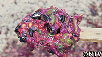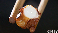 DASH島で3年前から夏の岩場で狙う定番の獲物“ショウジンガニ"。今年もそのカニをひっこくりで狙う。その餌に使ったのは、島に流れ着いた漂着物のキムチ。キムチの匂いでカニをおびき寄せようと岩場で待ちかまえていると、発見したのは、夏が旬の高級食材のマダコ。なんとか匂いでおびき寄せ、素潜り漁で使うカギ棒を使って捕まえることに成功した。そのマダコのぬめりを藻塩で塩揉みして、ぶつ切りにして、アケビ油で揚げて素揚げに。歯応えこそ最高だったが、塩揉みした際に、十分に塩を洗い落とさなかったため、かなりしょっぱい仕上がりになってしまった。 |