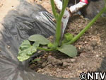 竹に注いだ水がゆっくりと根元を湿らせてくれ、土壌が硬くなってしまうのを防いでくれる。水を与えすぎても、与えなくてもうまく育ってくれないメロン栽培に適した水やりの方法だった。また、メロンは水の調節で味も網目も決まってしまうので、成長の節目に適した水やりを心がけなければならない。 |