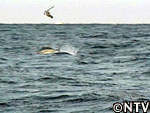 すると、目線の先でマグロが海面から顔を出した!