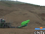 集まった男たち30人が、一気に台に飛び乗り、押し出された空気によって、カエルが跳び出す仕組みで、大ジャンプに挑んだ!