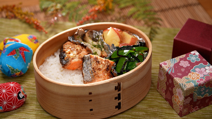 ② 焼き終わったら、お弁当箱に炊き上がったお米を詰める。