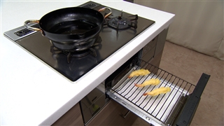 ・通常は、天ぷら鍋で揚げ、油切りバッドに置いて油を切るが、魚焼きグリルを使えば簡単に油を切ることが出来る!