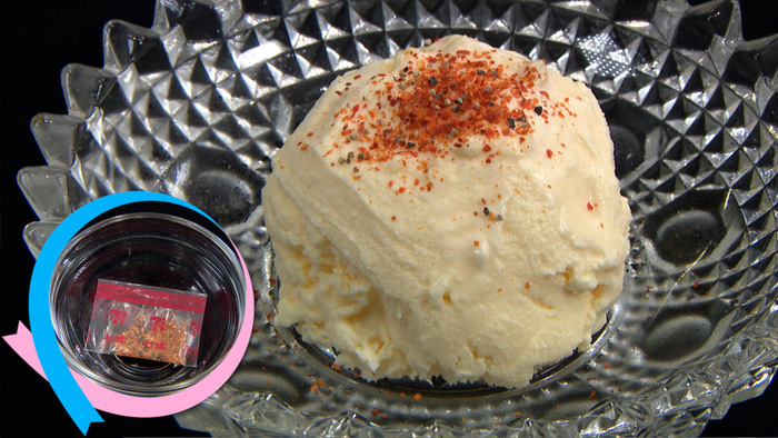 ①器にバニラアイスを入れ、七味唐辛子を乗せ混ぜる