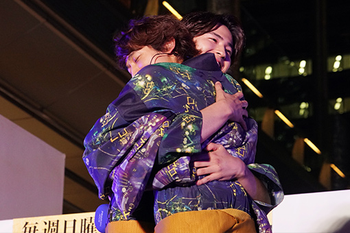 - 加藤諒「このおそろいの衣装、シゲさんも着たいと言っていたんですが、生地が足りなかったみたいで、僕たちのみとなりました。現場はヒリヒリとした緊張感があるんですけど、こうして共演者と楽しみながらお話できる機会ってあまりないので、ぶっちゃけトークができて楽しかったです」