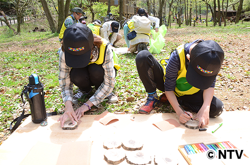 当日は、7歳の小学生から75歳の方まで約100人のボランティアの皆さんが、朝から夕方まで様々な活動を行いました。午前中は5班に分かれ自然観察教室を行い、午後は3グループに分かれ、日本の在来種に悪影響を与える外来種「キショウブ」の除去、ほかの植物の成長を妨げる「アズマネザサ」の刈り取り、自然観察路の「ロープ柵の修理」などの里山を守る作業を行いました。また、活動の記念として、コナラの間伐材に24時間テレビの焼き印を押してコースターを作りました。