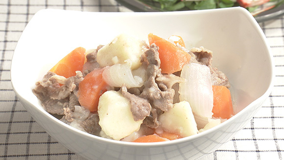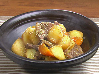 牛肉、じゃが芋、玉ねぎを使用した基本の肉じゃがです。だし汁も水も加えずに、調味料と素材の水分だけで蒸し煮するのがポイント。フライパンで作れる手軽さがうれしい♪