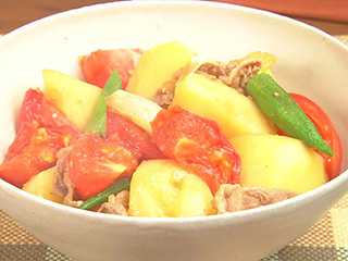 トマトを使ってさっぱり仕上げた肉じゃが。豚肉やトマトからうま味がでるので、だし汁を使わずに作れます♪いつもの肉じゃがをアレンジしたいときにオススメです!