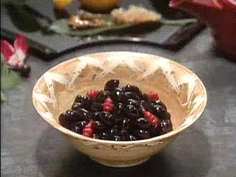 ・ふっくらとやわらかく煮あげる煮方には、丹波産の大粒の黒豆が理想です。 ・鉄材は、料理専用の“鉄卵”や、錆び釘6~7本をさっと洗ってガーゼに包んで使います。 ・火加減は必ずごく弱火で。火加減が強いと豆がやわらかくならないうちに煮汁が煮つまってしまいます。 ・暮の28、29日頃に煮て、31日まで毎日一度、豆が煮汁に浸る状態にして弱火で日を通します。あとは密閉容器に入れ、冷蔵庫に入れれば、5~7日は味が変わりません。 ・盛り付けるときに、好みで長老木をあしらいます。