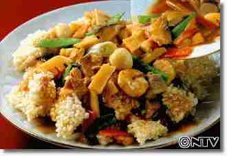 炒める鍋は“油ならし”をしっかりしておくこと。合わせ調味料を加えてから、おこげを 揚げ始めること。そしてあんのとろみはうすめにつけるのが「いい音」への ポイントです。