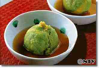 中のえびだんごは、弾力が残る位に電子レンジで加熱します。茶巾しぼりの要領で包みますが、ギューギュー絞らず、やさしくさわって形づくります。