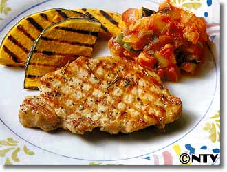焼いている途中、肉を90度回してグリル板に押しつけ格子模様の焼き色をつけましょう。