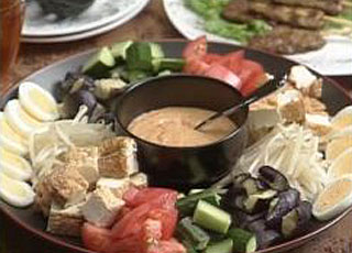野菜の下ごしらえは電子レンジであとはソースを作るだけ。ガドガドソースのピーナッツバターを加える時は、焦げつかせない様に火加減には注意しましょう。この2品、バリ島旅行ではおなじみですね。是非BGMにもこだわリましょう。