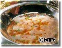 初春を祝って紅白の白玉に。 口の中に広がる シャンパンの清涼感が新鮮です。 基本の白い白玉と、いちごのピューレを加えたピンクの白玉をゆるく固めたゼリーに浮かべ、フランボワーズの赤、ミントの緑を彩りよく散らし、いただく直前にシャンパンを流します。いちごのピューレは、ワイン洗いをしたいちごに15%の粉糖とレモン汁を加え、ミキサーにかけたもの。透明のゼリーはシロップにレモンの皮のすりおろし、レモン汁、キルシュ、白ワインを加えた香りのよいもの。白玉がやっと浮くくらいの、ゆるいゼリーにしましょう。