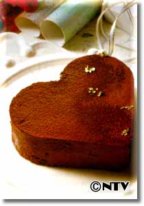 型に流す時はメレンゲの量を2割程減らして作る。写真はハート型(縦直径13×高さ3.5cm)に流して冷やし固め、ココアをふって金箔をあしらったもの。バレンタインデーのプレゼントにおすすめ。