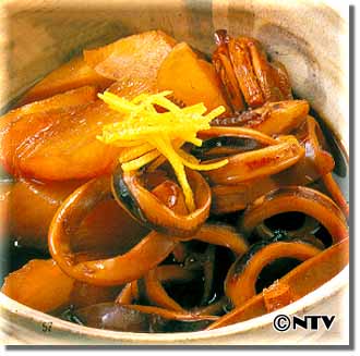 大根のなた切りは皮をむいてから、鉛筆を削るようにまわしながら切っていきます。先にいかに味をからめてからだし汁と大根を加えるのが柔らかく煮上げるポイントです。