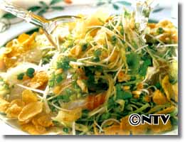 素材はすべてつめたーく冷やしておくことがポイントです。鯛は切ってからラップをして冷蔵庫に入れておくこと。レタスやねぎも切った後盛りつける直前まで冷たくしておきます。