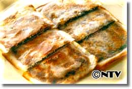 もう一品の春巻きあんサンドは春巻きの皮のザラザラした裏面にあんをぬっていきます。あんが堅いようなら少し水分を加えてのばしてからぬるとよい。多めの油で強火でカリカリに焼き上げましょう。