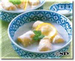 もう一品のデザートはグラグラ煮立てず弱火でさっとバナナが煮える程度でよい。このデザートは冷めるとココナツミルクが分離してしまうので温かいうちに食べましょう。