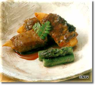 牛肉は脂身の少ないものを選びます。たけのこを巻く時牛肉は細い方から太い方に向かって巻いていき、巻き終わりを下にして焼きます。