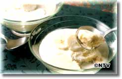 デザートは冷蔵庫に約2時間いれて固めます。氷水をあてておくともう少し早くかたまります。彩りにミントの葉を飾るとよい。