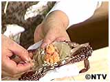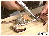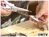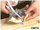 5)胴は上の殻に切り込みを入れてから、半分に割ります。