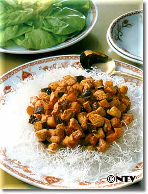 炒める材料はすべて1cm角に切ります。(但し、鶏肉は縮むので大きめに)春雨は油鍋にほぐしながら入れジュワッとあがったら裏返してからザーレンにあけ、くずしておきます。