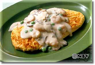 3)全体が半熟になったら、半分に折り、フライパンのカーブを利用して形作ります。